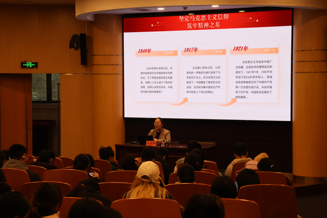 随后,习近平文化思想专论课学生宣讲团讲师朱湘婷以《青春 理想 信念》为题,进行党课讲授。她从“坚定信仰筑牢精神之基”“胸怀共产主义远大理想”“坚定理想信念勇担青春使命”三个维度,深入解读了中国共产党百年奋斗的思想基础与精神源动力。通过分享自己在新疆参与西部计划的亲身经历,展现了共产党员在基层一线默默奉献、担当使命的真实图景。
