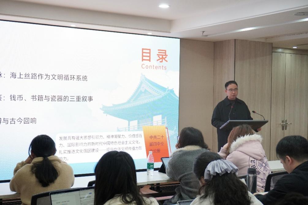徐汇校区开班仪式后,人文学院副教授康昊以《跨越千年的相遇:海上丝路与东亚文明的交流互鉴》为题为学员授课。通过钱币、书籍与瓷器的历史叙事,生动阐释了文明在开放包容中发展璀璨的规律。他强调,要深刻领会中共二十届四中全会精神,高举和平发展旗帜,在深化中外文明交流互鉴中,丰富发展人类文明新形态,以开放包容心态推动中华文化走向世界,为强国建设、民族复兴贡献力量。随后,学员集体观看红色电影《望道》。