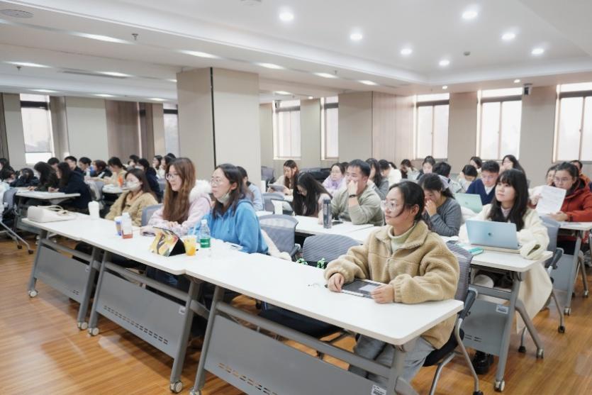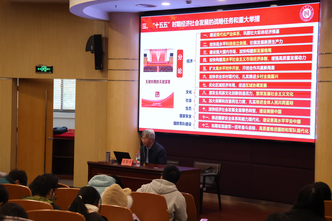 奉贤校区开班仪式后,人文学院吴夏平教授首先作党的二十届四中全会精神宣讲专题党课。他以图文结合的方式,系统梳理了“十四五”时期我国发展取得的重大成就,阐释了“十五五”时期的建设方向与发展目标。