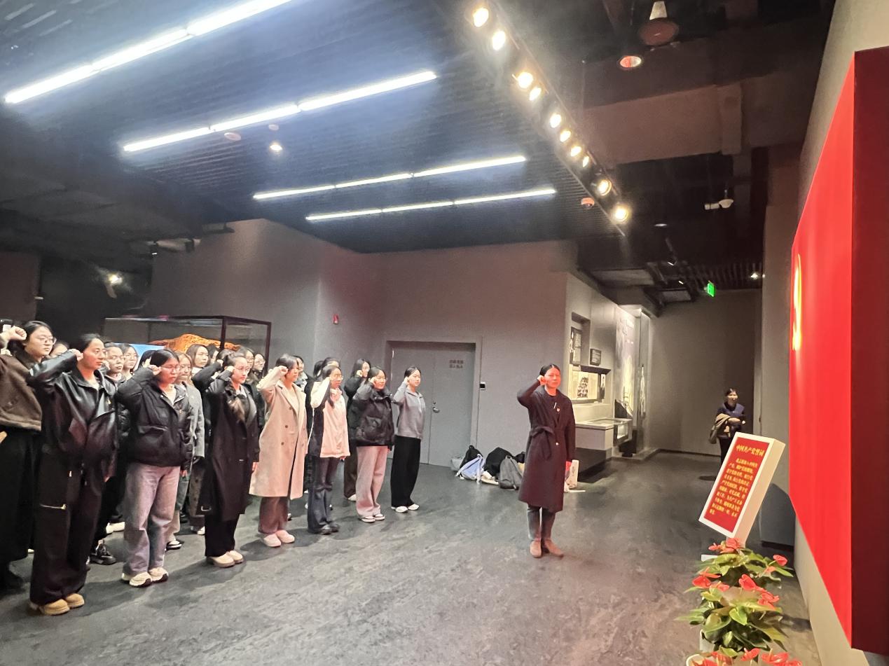 接下来,全体师生共同参观了纪念馆的基本陈列。透过1500余幅历史照片、400多件珍贵实物及丰富展陈,大家重温了党组织从创立到发展壮大的光辉历程,深刻感悟早期共产党人对党忠诚、严守纪律、勇于牺牲的崇高精神。紧接着,在纪念馆内鲜红的党旗下举行了庄严的入党宣誓仪式。教育学院学生工作负责人潘梦琳领誓,全体新党员高举右拳,面对党旗铿锵有力地宣读入党誓词,表达了为共产主义奋斗终身的坚定决心。