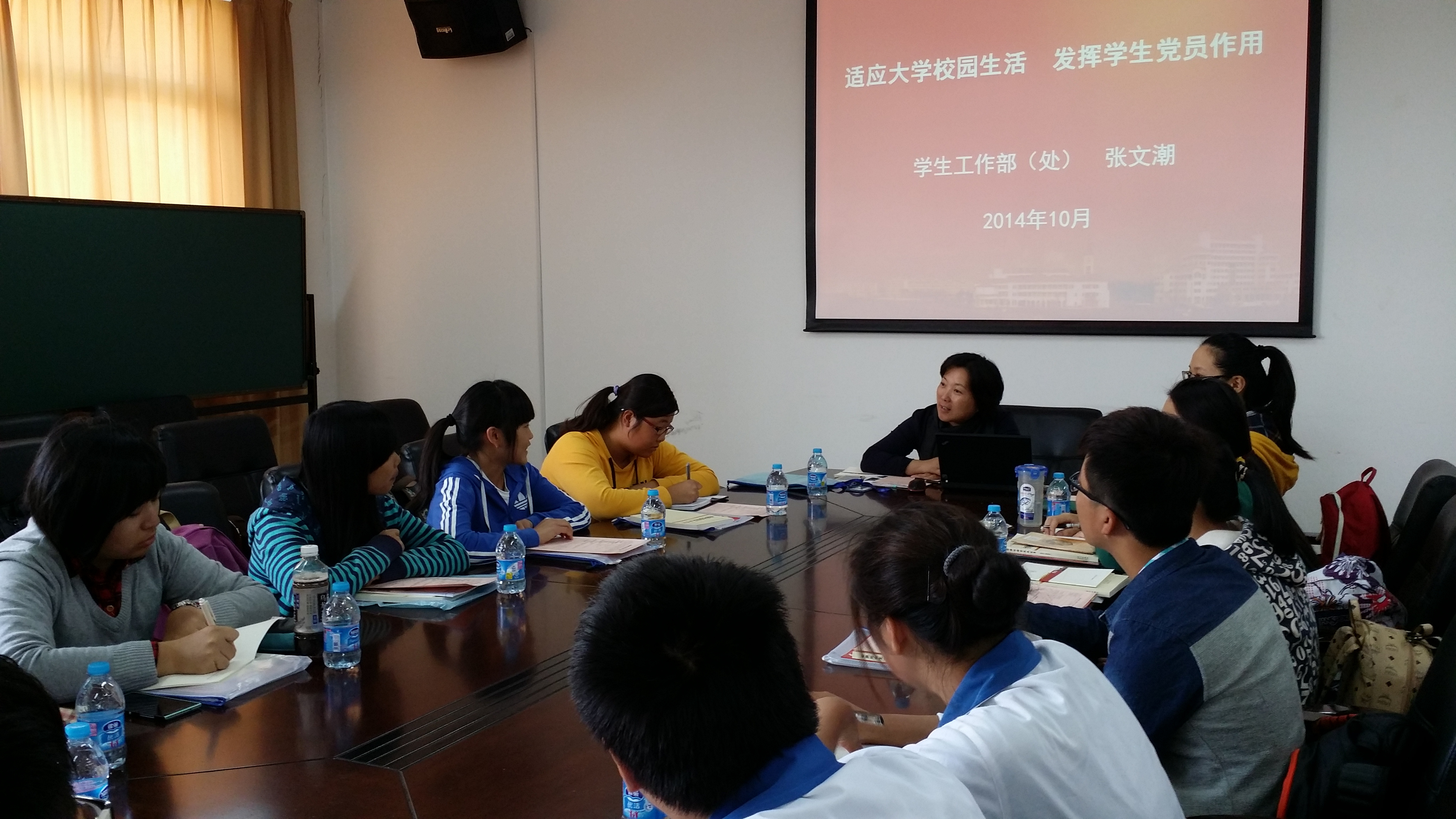 10月15日,校学生工作部(处)部(处)长张文潮应邀作了《适应大学校园生活,发挥学生党员作用》的报告。在报告中,她介绍了我校学生的基本情况,尤其是毕业生就业情况,并重点介绍了我校学生党员发挥作用的途径与平台,即围绕学校“造就卓越教师,培养都市新人”的人才培养目标,充分发挥党建引领的作用,重点搭好四大平台:基础文明的展示平台、优良学风的专业平台、志愿服务的社会平台、服务学生的关爱平台。她希望新生党员坚持树立远大理想、时刻牢记党的宗旨、不断树好党员形象。