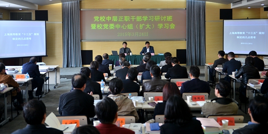 上海市教委副主任丁晓东作关于“上海高等教育改革的形势和任务”的首场辅导报告。他从当前上海发展的深层次矛盾和瓶颈问题出发,向学员们详细解读了上海高等教育改革发展面临的新形势、新任务和新挑战,介绍了制定上海高等教育“十三五”规划的主要精神和重点内容。最后,他对学校发展提出了八个方面的建议:在落实全面深化改革方案上下功夫;更加关注教育教学质量;提升教书育人和教学科研质量;切实推动人才培养模式改革;有效抓住骨干教师激励计划机遇;积极探索建立现代大学制度建设;推动人事分配制度改革;紧紧把握教育信息化发展趋势。