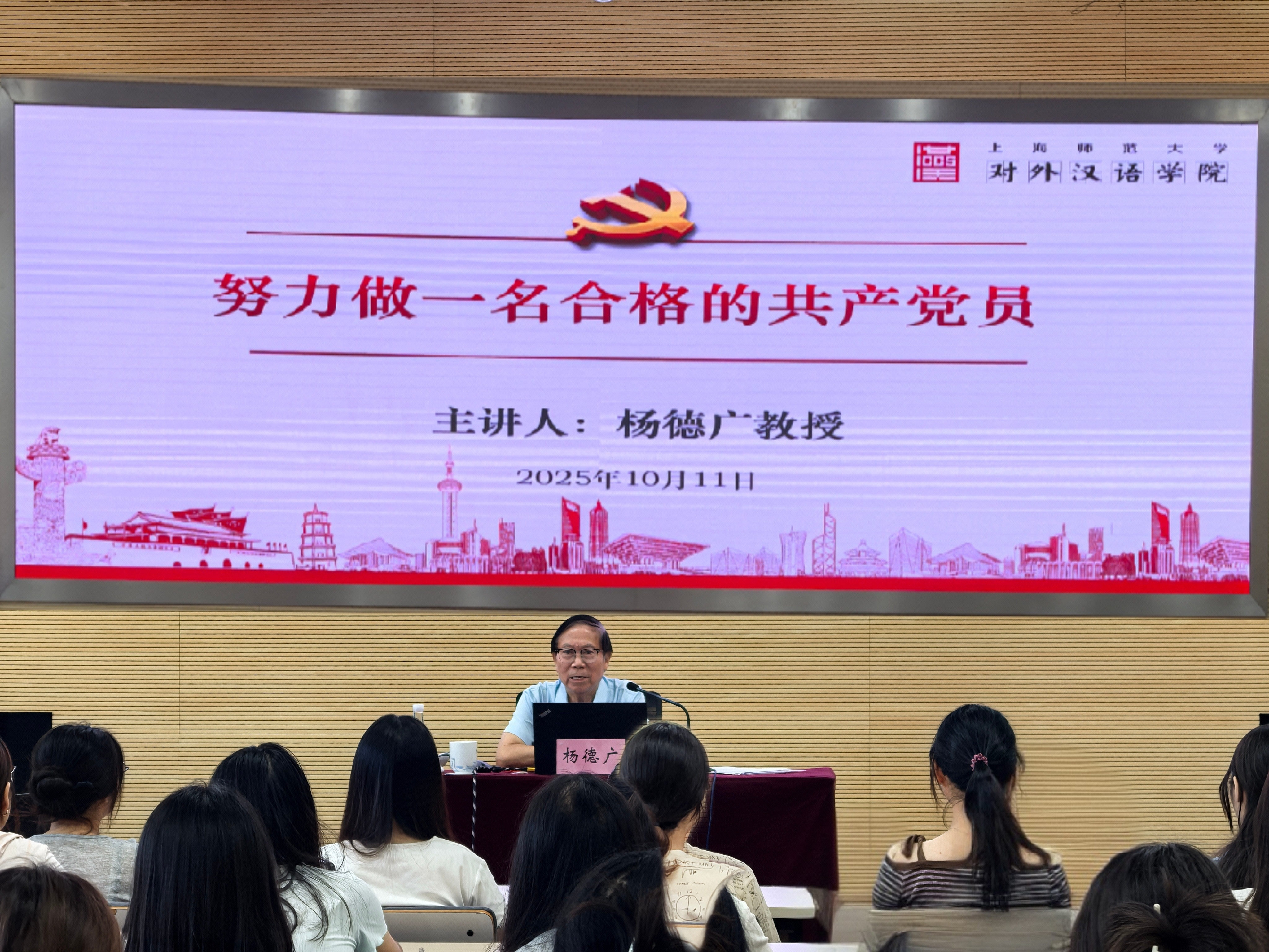 为深入贯彻党的教育方针,引导2025级研究生新生坚定理想信念,积极向党组织靠拢,2025年10月11日,对外汉语学院特邀上海师范大学原校长、学院党建工作督导杨德广教授,作题为“努力做一名合格的共产党员”专题讲座。讲座由学院副院长李文浩主持。