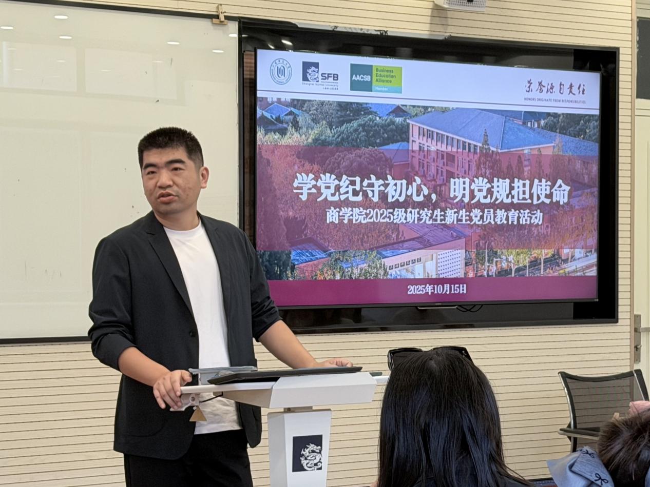2025年10月15日16:00,商学院党委于徐汇校区六教A座203教室,精心组织开展了2025级研究生新生党员教育活动。此次活动以“学党纪守初心,明党规担使命”为主题,旨在为新生党员扣好研究生阶段的“第一粒扣子”,筑牢信仰之基。学院党委副书记、纪检委员傅毅老师担任主讲人,全体2025级研究生新生党员满怀热忱,积极参与了本次党课学习。